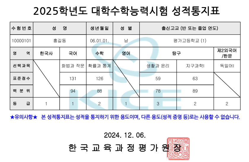 2025학년도 수능 성적표 발급일은 2025년 12월 6일(금) 오전 9시 입니다. 2025학년도 수능 성적표는 12월 6일 배부될 예정입니다. 2025학년도 수능시험 성적통지표 양식은 아래와 같습니다. 2025학년도 수능 성적통지표에는 수험번호, 성명, 생년월일, 성별, 출신고교가 기재되어 있습니다. 2025학년도 수능 성적표에는 수험생 본인이 응시한 영역의 과목명과 표준점수, 백분위, 등급이 기재되어 있습니다.