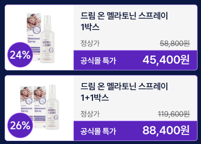 멜라토닌 스프레이의 가격은 브랜드에 따라 다르지만, 드림온 멜라토닌 스프레이의 경우 1개당 약 4만원대에 구매하실 수 있어요. 대량구매 시 좀 더 할인된 가격에 구매하실 수 있으니 참고하시기 바라요. 공식 판매처 링크를 남겨 놓을 테니 필요하신 분은 구매 전 가격 및 할인 여부를 꼭 확인하시기 바라요.