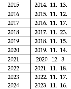 2. 수능 시험 역대 날짜를 살펴보겠습니다. 수능시험이 치루어진 날짜정보를 살펴보면 2015년부터 2024년까지 1번을 제외하고는 모두 11월이었습니다 2021 수능은 코로나로 연기된 수능이었습니다.