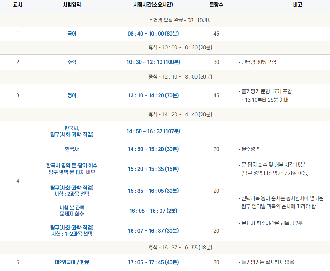 셋째, 컨디션 관리도 실력입니다. 수능시험 시간에 맞춰 컨디션을 유지하도록 합니다. 아래 수능 시험 시간표를 보고 자신의 컨디션을 수능시험 당일의 시간표에 맞게 잘 유지할 수 있다면 최고의 성적을 받을 수 있습니다.