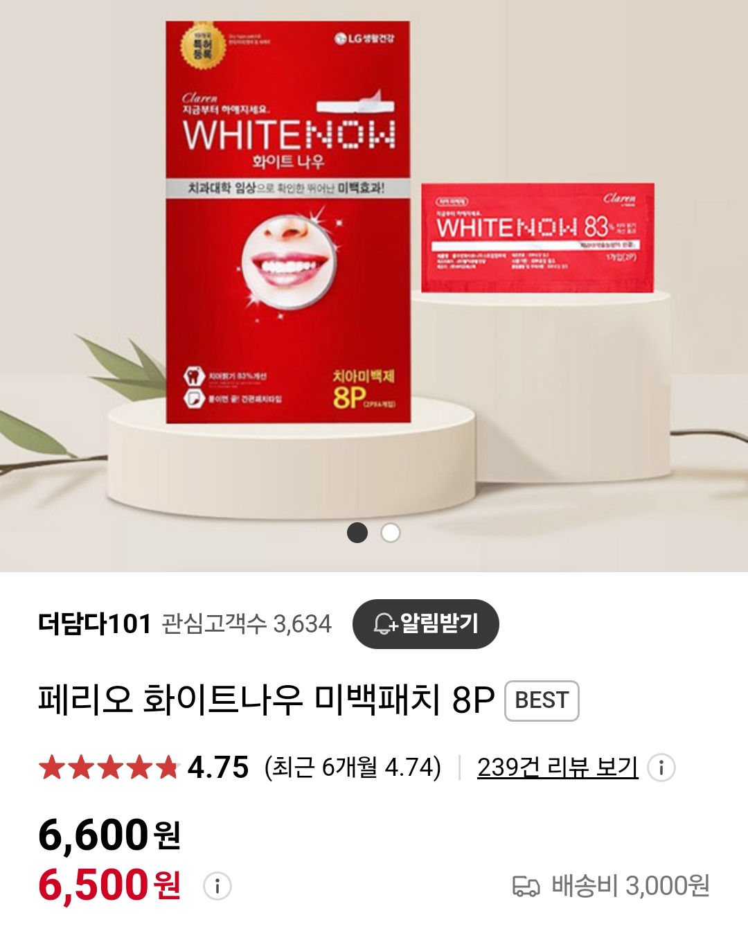 치아 미백 패치는 치과에서 미백 치료 만큼은 아니지만 미백 효과를 기대할 수 있는 아이템입니다. 치아 미백은 자신감 있는 미소의 근원입니다. 특히 면접에서 첫인상 중 웃는 얼굴이 중요한데요, 웃는 얼굴과 함께 깨끗한 치아는 그 사람의 좋은 인상을 결정합니다. 8개 6,600원이니, 한개에 900원정도로 미백 효과를 기대해볼 수 있습니다.